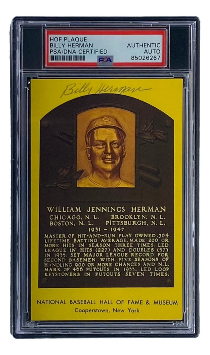 Featured is a Billy Herman (Chicago Cubs) signed 4x6 Hall Of Fame plaque card. This card has been hand signed by Herman and has been authenticated and encapsulated by PSA/DNA. This card would make a great addition to any sports memorabilia collection!.