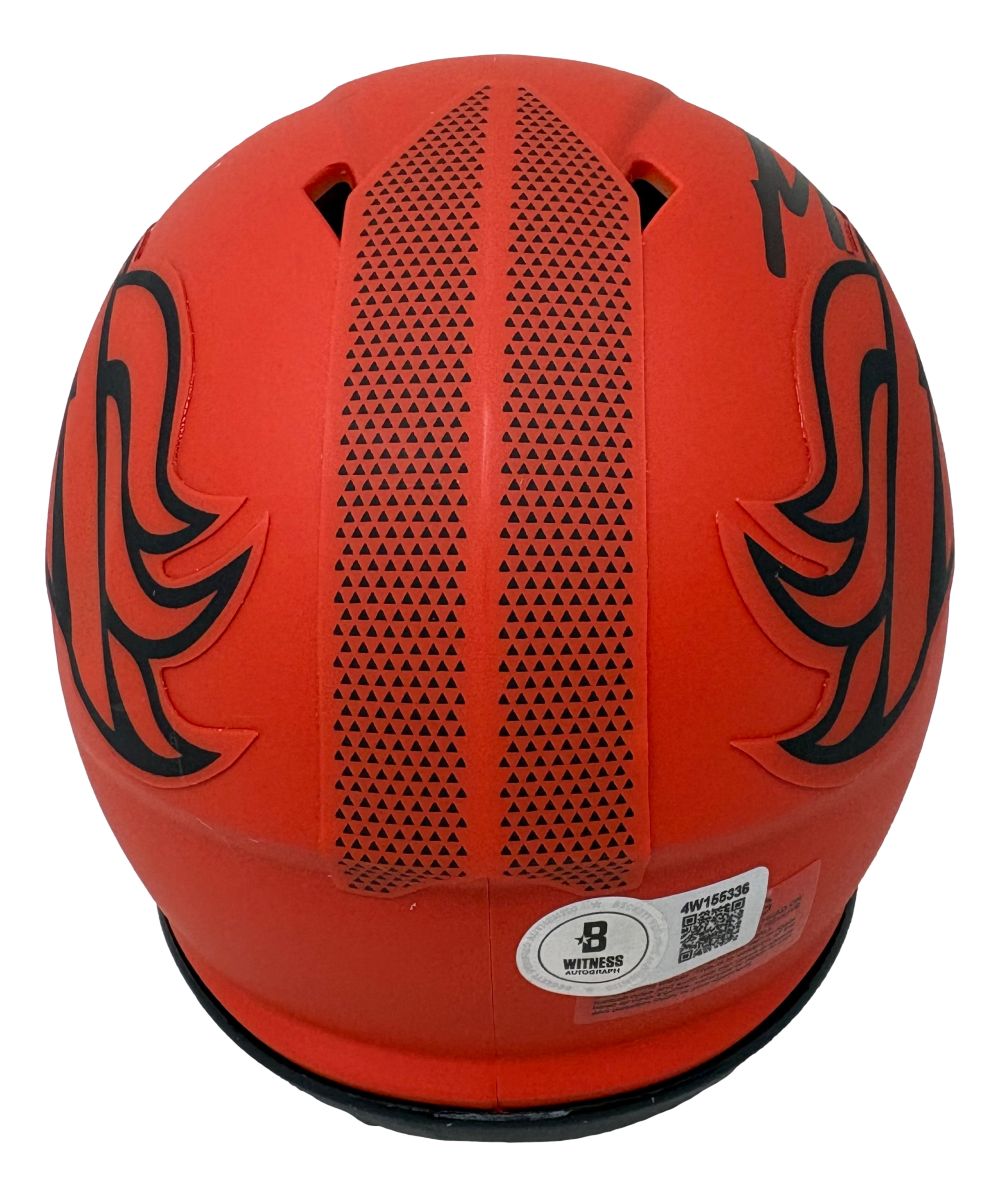 Featured is a Bo Nix signed Denver Broncos mini speed helmet. This helmet has been hand signed by Nix and comes with the Beckett hologram and certificate of authenticity. This helmet would make a great addition to any sports memorabilia collection!.