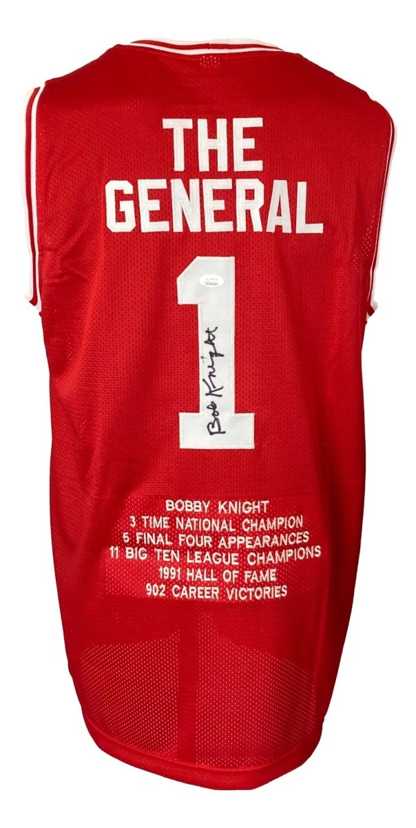 Featured is a Bob Knight signed custom basketball jersey. This jersey has been hand signed by Knight and comes with the JSA hologram and certificate of authenticity. This jersey features professionally sewn letters and numbers and is size XL. This jersey has no team tags or emblems and is intended as a sports collectible. This jersey would make a great addition to any sports memorabilia collection!
