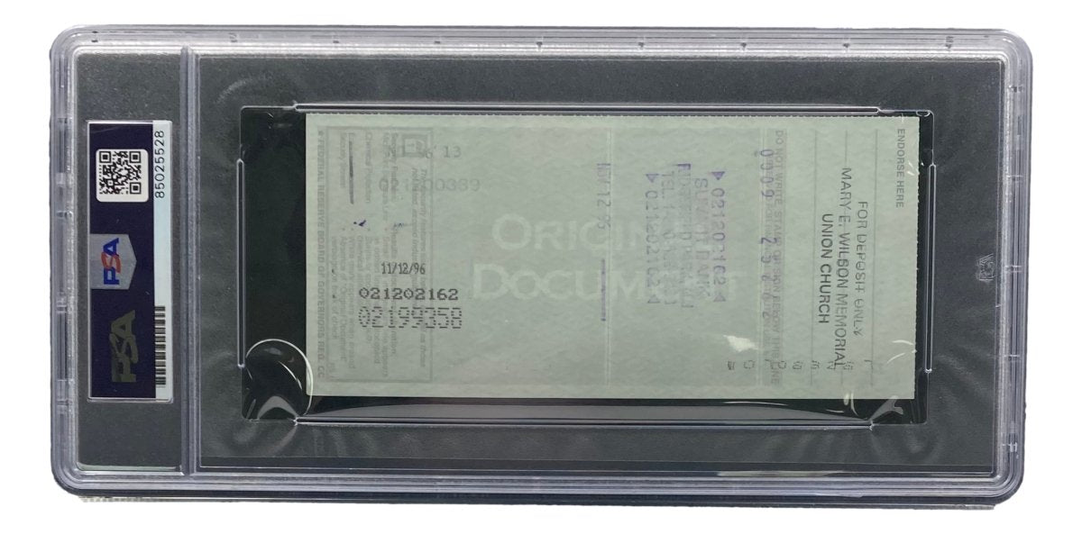Featured is a Bobby Thomson (New York Giants) signed bank check. This check has been hand signed by Thomson and has been authenticated and encapsulated by PSA. This check would make a great addition to any sports memorabilia collection!.