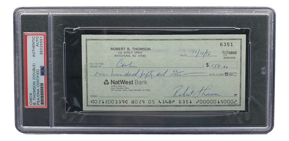 Featured is a Bobby Thomson (New York Giants) signed bank check. This check has been hand signed by Thomson and has been authenticated and encapsulated by PSA. This check would make a great addition to any sports memorabilia collection!.