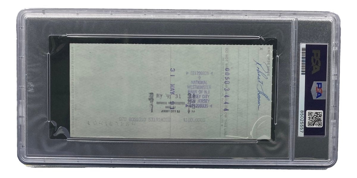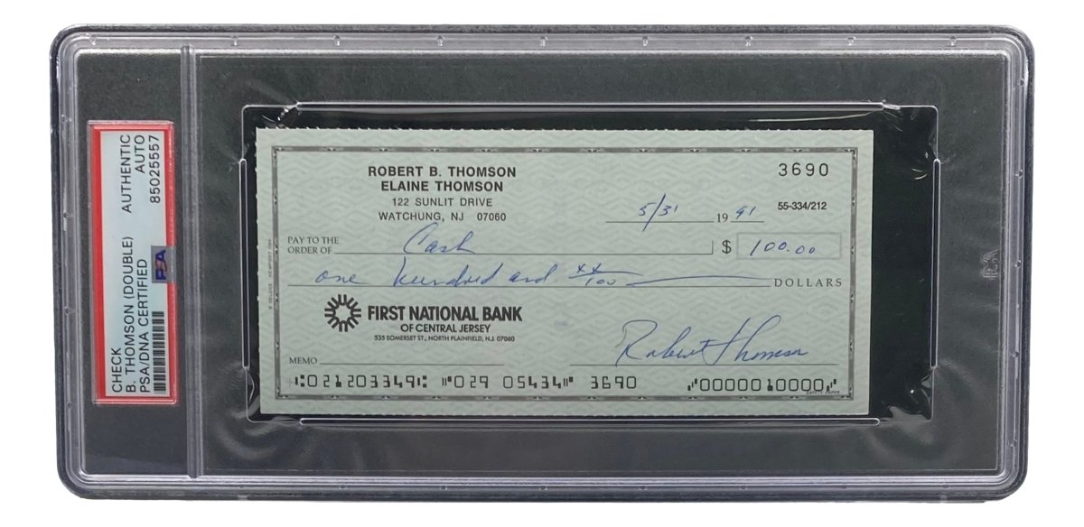 Featured is a Bobby Thomson (New York Giants) signed bank check. This check has been hand signed by Thomson and has been authenticated and encapsulated by PSA. This check would make a great addition to any sports memorabilia collection!.