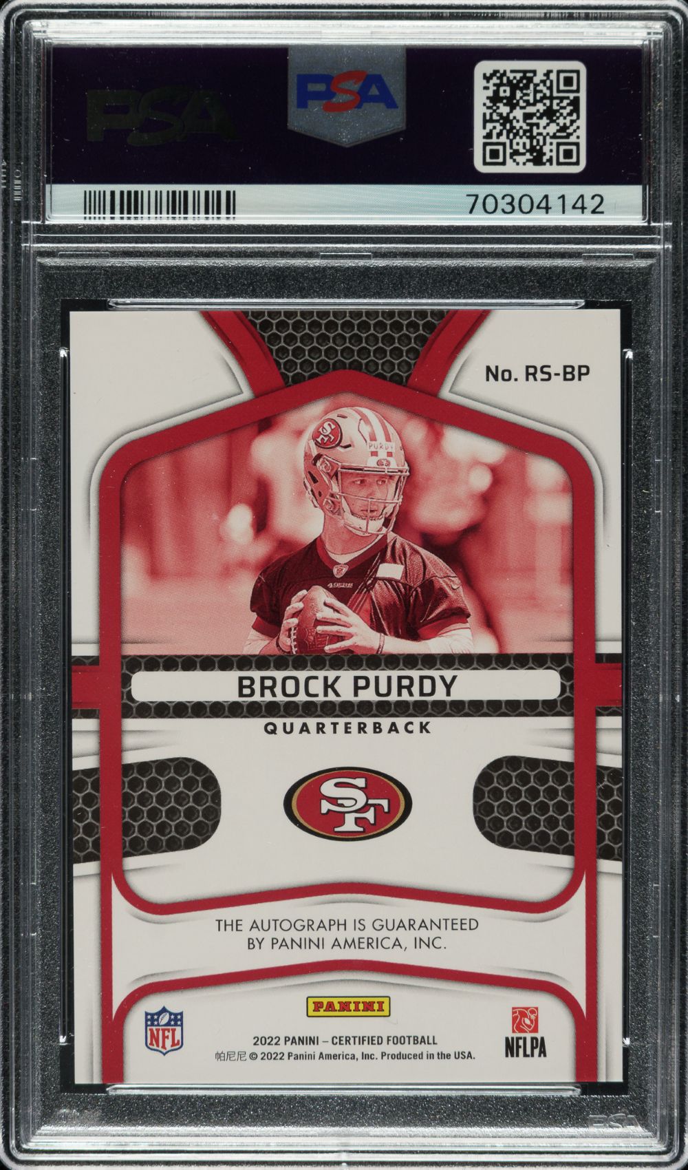 Featured is a Brock Purdy signed 2022 Panini Certified #RSBP rookie card. This card has been hand signed by Purdy and has been authenticated and encapsulated by PSA, receiving a condition grade of Gem MT 10 and an autograph grade of Gem MT 10. This card would make a great addition to any sports memorabilia collection!