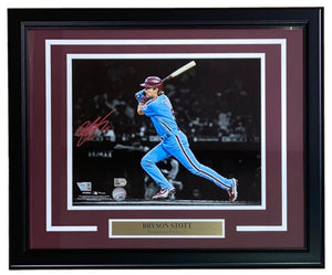Featured is a Bryson Stott signed 11x14 Philadelphia Phillies photo. This photo has been hand signed by Stott and comes with the Fanatics hologram and certificate of authenticity. This photo has been professionally framed and matted and is approximately 16x20. This photo would make a great addition to any sports memorabilia collection.