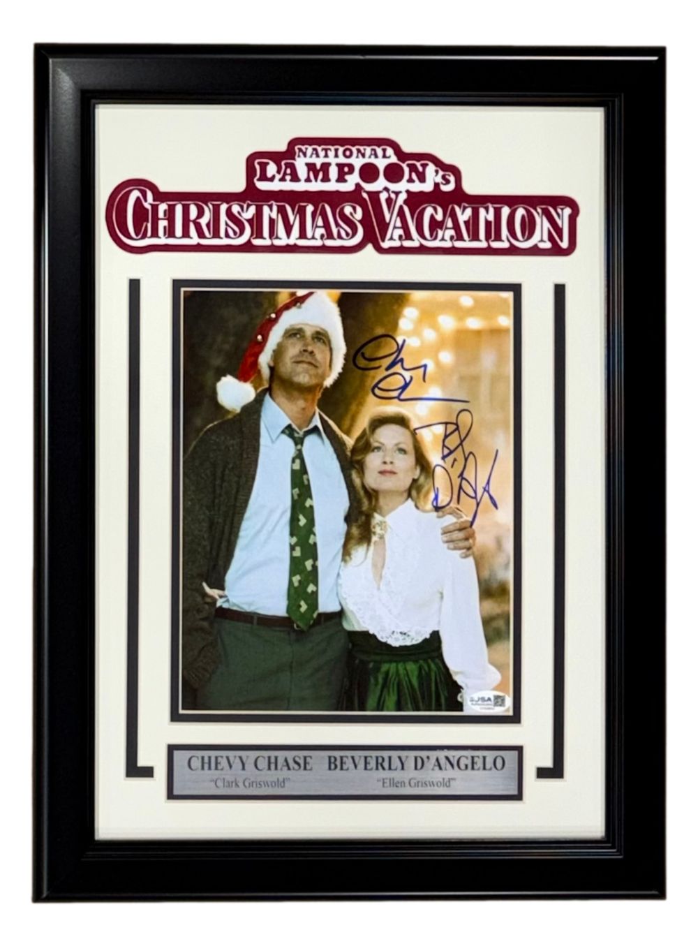 Featured is a Chevy Chase and Beverly D'Angelo signed 8x10 National Lampoon's Christmas Vacation photo. This photo has been hand signed by Chase and D'Angelo and comes with the JSA hologram. This photo has been professionally framed and matted and is approximately 14x20. This photo would make a great addition to any entertainment memorabilia collection!