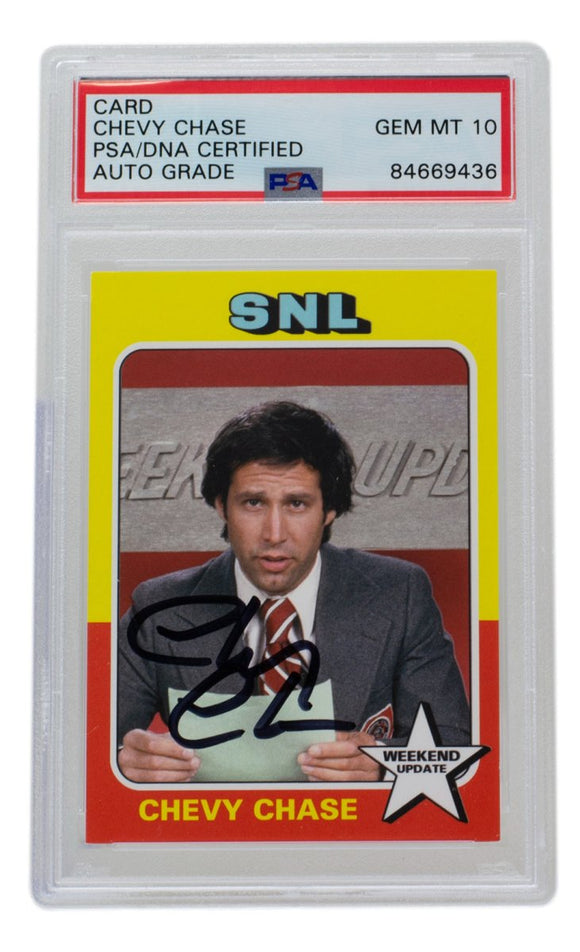 Featured is a Chevy Chase signed SNL Weekend Update trading card. This card has been slabbed and authenticated by PSA authentication services giving the autograph a Gem Mint 10 grading. This item would make a great addition to any sports memorabilia collection!..