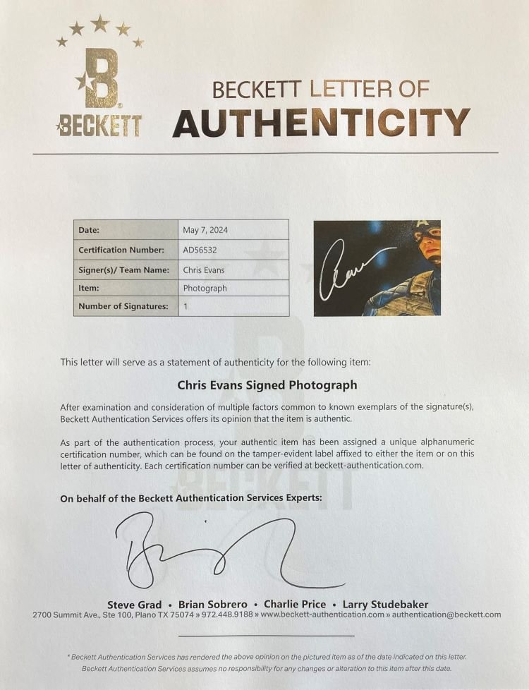 Featured is a Chris Evans signed 16x20 Captain America photo. This photo has been hand signed by Evans and comes with the Beckett hologram and letter of authenticity. This photo has been professionally framed and matted and is approximately 22x27. This photo would make a great addition to any entertainment memorabilia collection!.