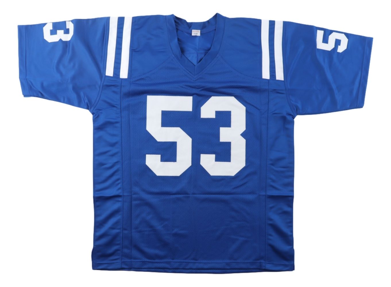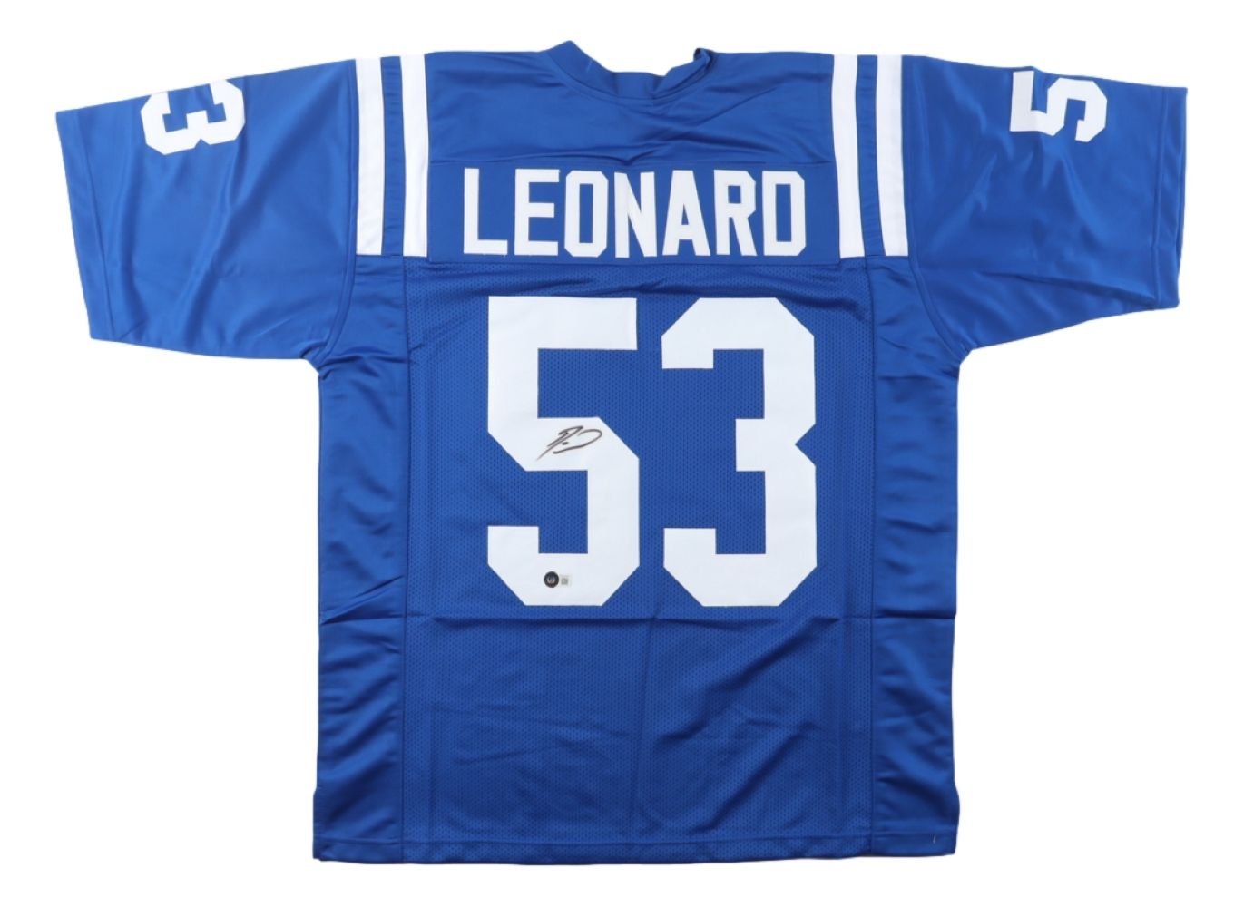Featured is a Darius Leonard signed custom football jersey. This jersey has been hand signed by Leonard and comes with the Beckett hologram and certificate of authenticity. This jersey features professionally sewn letters and numbers and is size XL. This jersey has no team tags or emblems and is intended as a sports collectible. This jersey would make a great addition to any sports memorabilia collection!.
