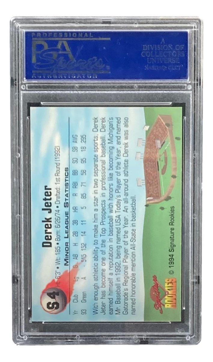 Featured is a Derek Jeter New York Yankees 1994 Signature Rookies #S4 rookie card. This card has been encapsulated by PSA, receiving a grade of Mint 9 for condition. This card would make a great addition to any sports memorabilia collection!.