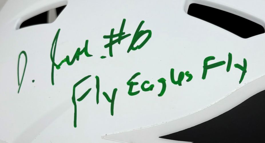 Featured is a DeVonta Smith signed Philadelphia Eagles full size speed replica helmet, inscribed "Fly Eagles Fly". This helmet has been hand signed by Smith and comes with the Beckett hologram and certificate of authenticity. This helmet would make a great addition to any sports memorabilia collection!.
