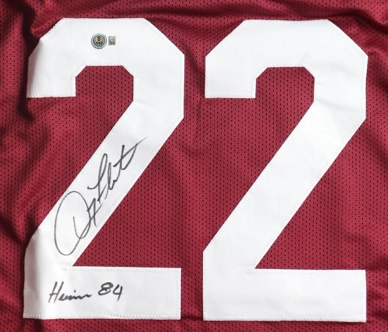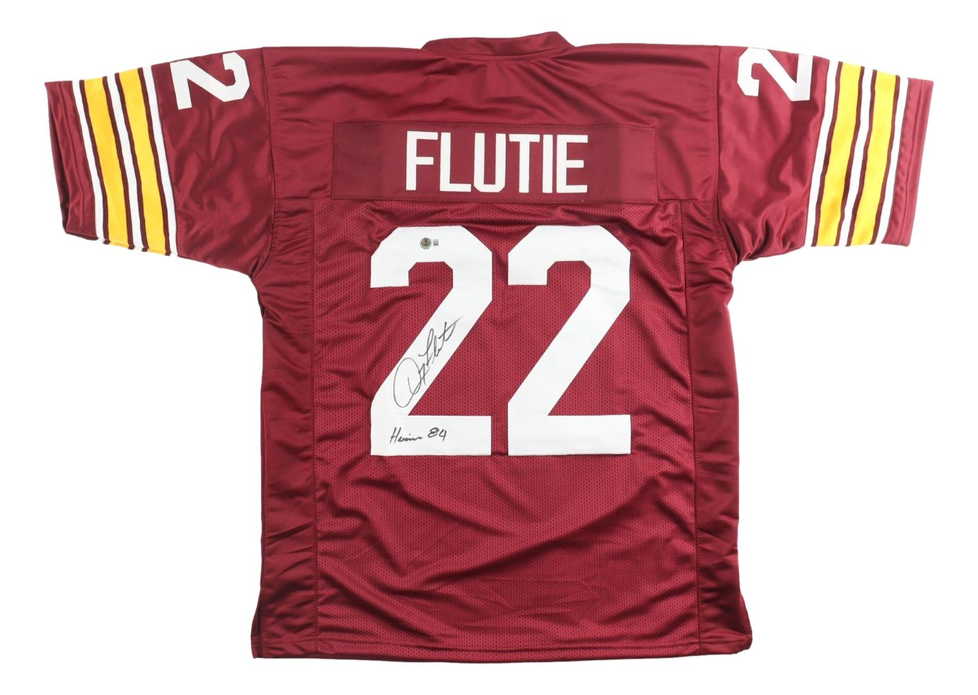 Featured is a Doug Flutie signed custom football jersey, "84 Heisman". This jersey has been hand signed by Flutie and comes with the Beckett hologram and certificate of authenticity. This jersey has professionally sewn letters and numbers and is size XL. This jersey has no team tags or emblems and is intended as a sports collectible. This jersey would make a great addition to any sports collection!.