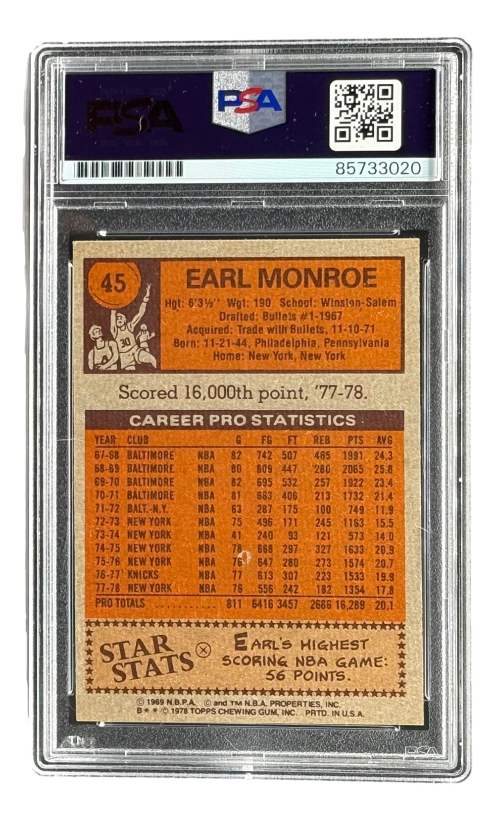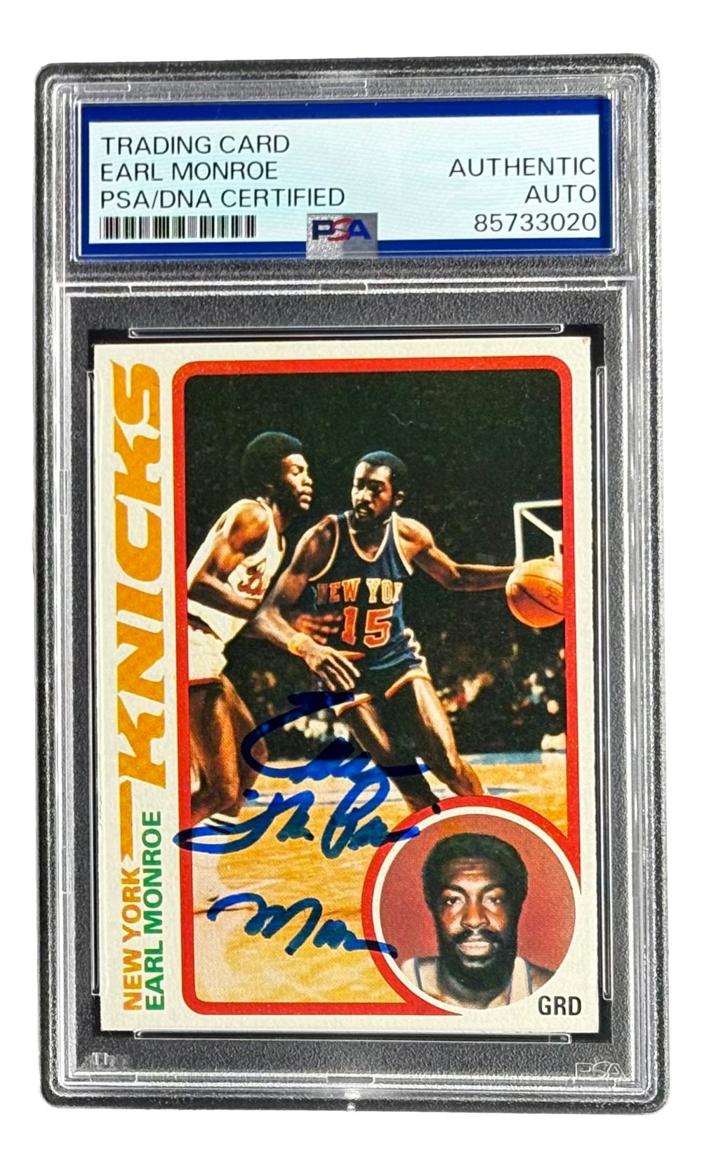 Featured is a Earl Monroe signed 1978/79 Topps #45 trading card, inscribed "The Pearl". This card has been hand signed by Monroe and has been authenticated and encapsulated by PSA/DNA. This card would make a great addition to any sports memorabilia collection.