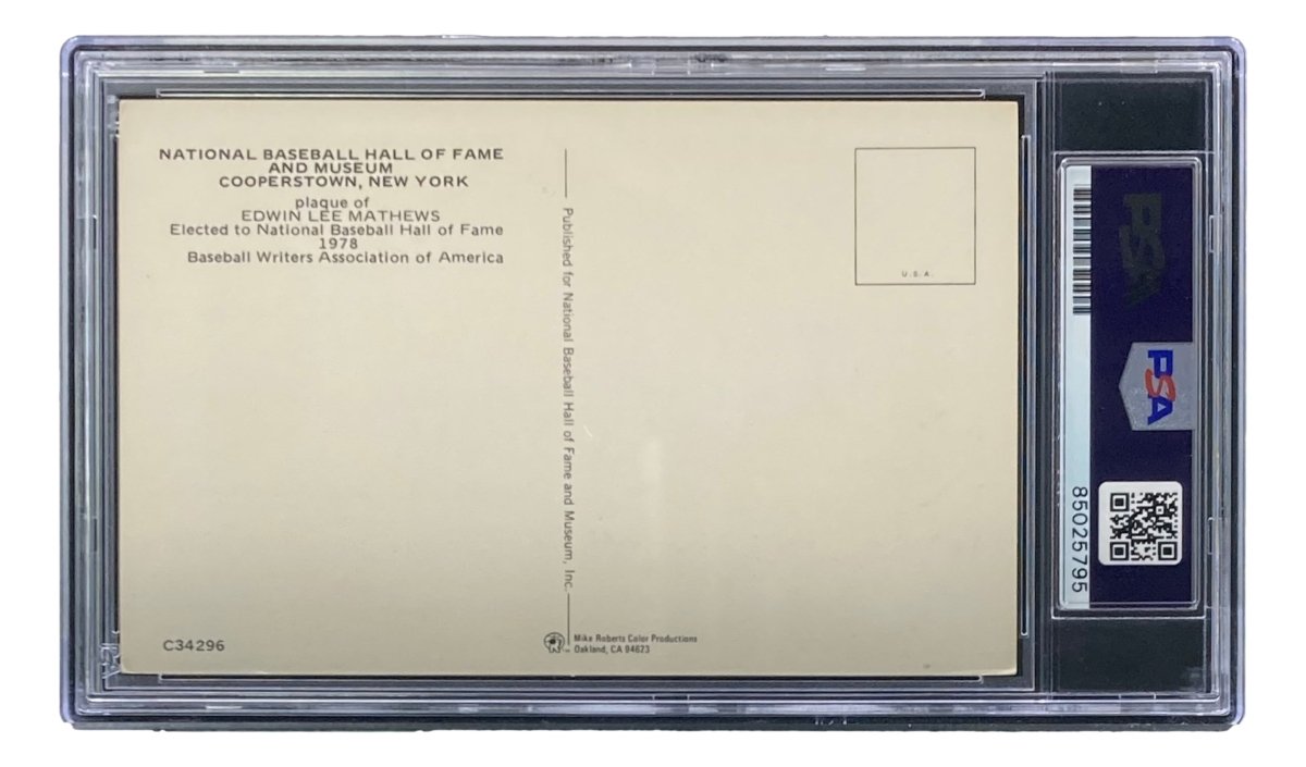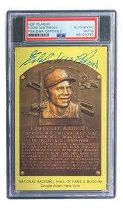 Featured is a Eddie Mathews (Milwaukee Braves) signed 4x6 Hall Of Fame plaque card. This card has been hand signed by Mathews and has been authenticated and encapsulated by PSA/DNA. This card would make a great addition to any sports memorabilia collection!.