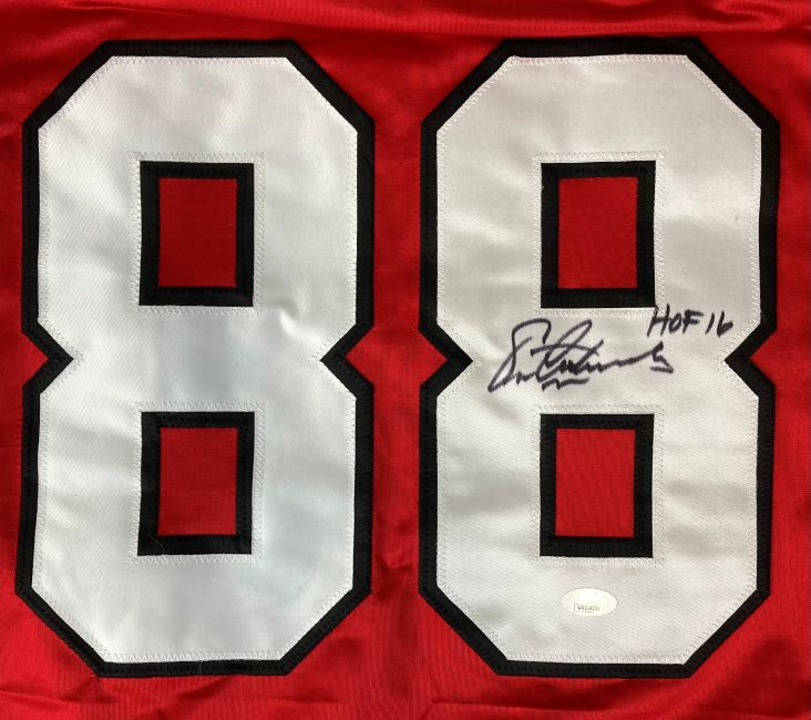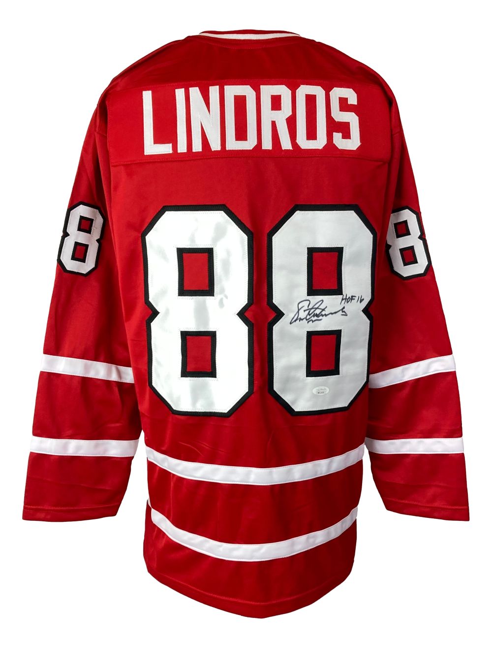 Featured is an Eric Lindros signed custom hockey jersey, inscribed "HOF 16" . This jersey has been hand signed by Lindros and comes with the JSA hologram and certificate of authenticity. This jersey features professionally sewn letters and numbers and is size XL. This jersey has no team tags or emblems and is intended as a sports collectible. This item would make a great addition to any sports memorabilia collection!.