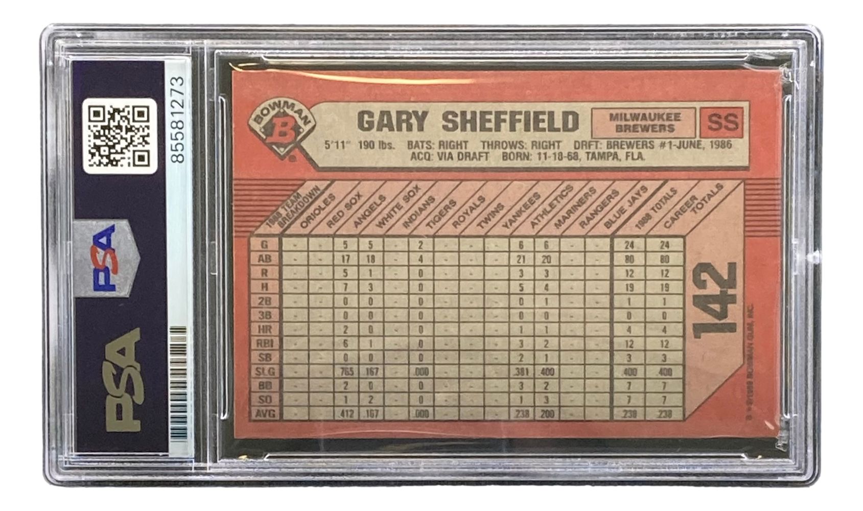 Gary Sheffield Signed 1989 Bowman #142 Milwaukee Brewers Rookie Card PSA