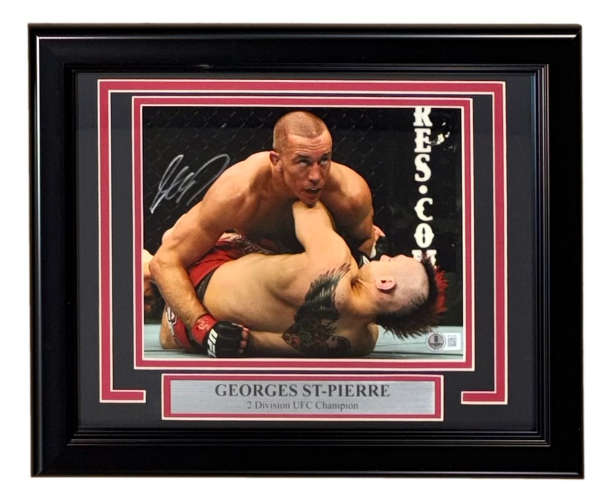 Featured is a Georges St-Pierre signed 8x10 UFC photo. This photo has been hand signed by St-Pierre and comes with the Beckett hologram and certificate of authenticity. This photo has been professionally framed and matted and is approximately 11x14. This photo would make a great addition to any sports memorabilia collection!.