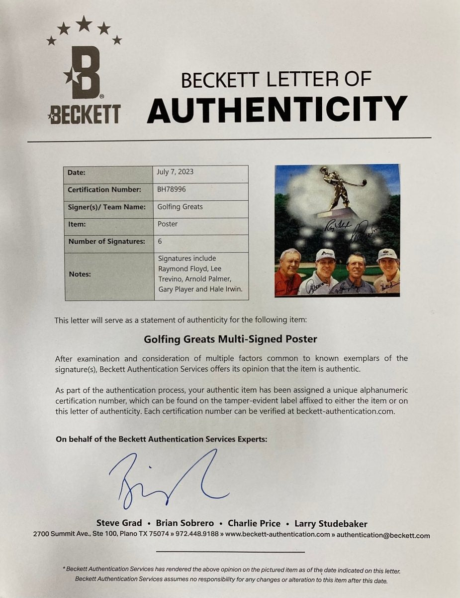 Featured is an Arnold Palmer, Raymond Floyd, Lee Trevino, Gary Player and Hale Irwin signed poster. This poster comes with the Beckett hologram and letter of authenticity. This photo has been professionally framed and matted and is approximately 20x32. This poster would make a great addition to any sports memorabilia collection!.