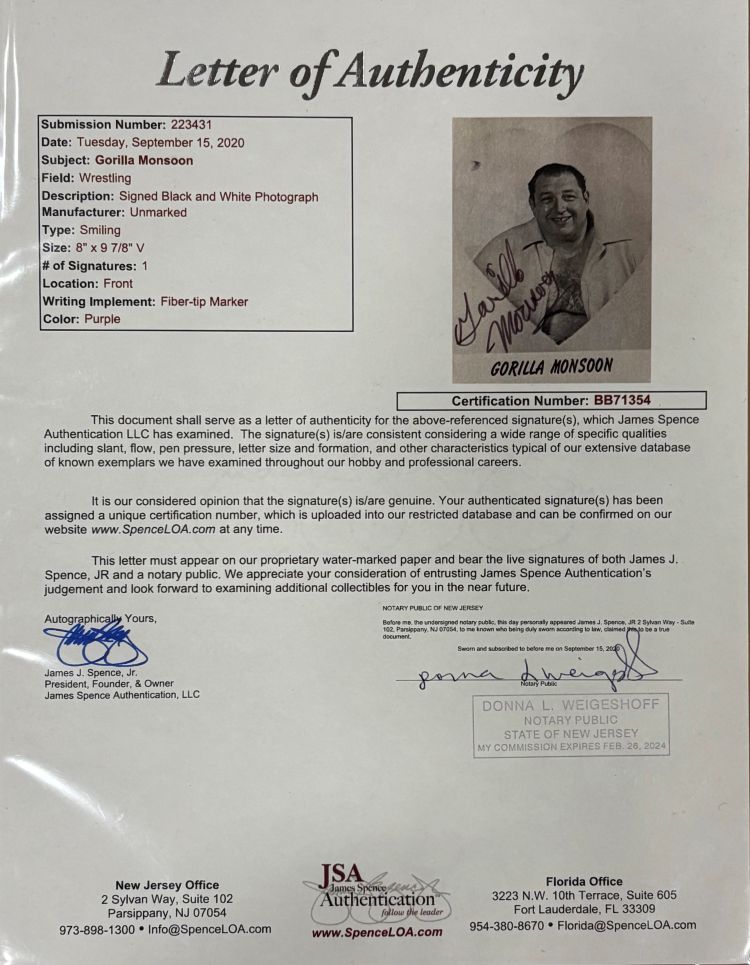 Featured is a Gorilla Monsoon signed 8x10 WWE WWF photo. This photo has been hand signed by Monsoon and comes with the JSA hologram and letter of authenticity. This photo has been professionally framed and matted and is approximately 11x14. This photo would make a great addition to any sports memorabilia collection!.