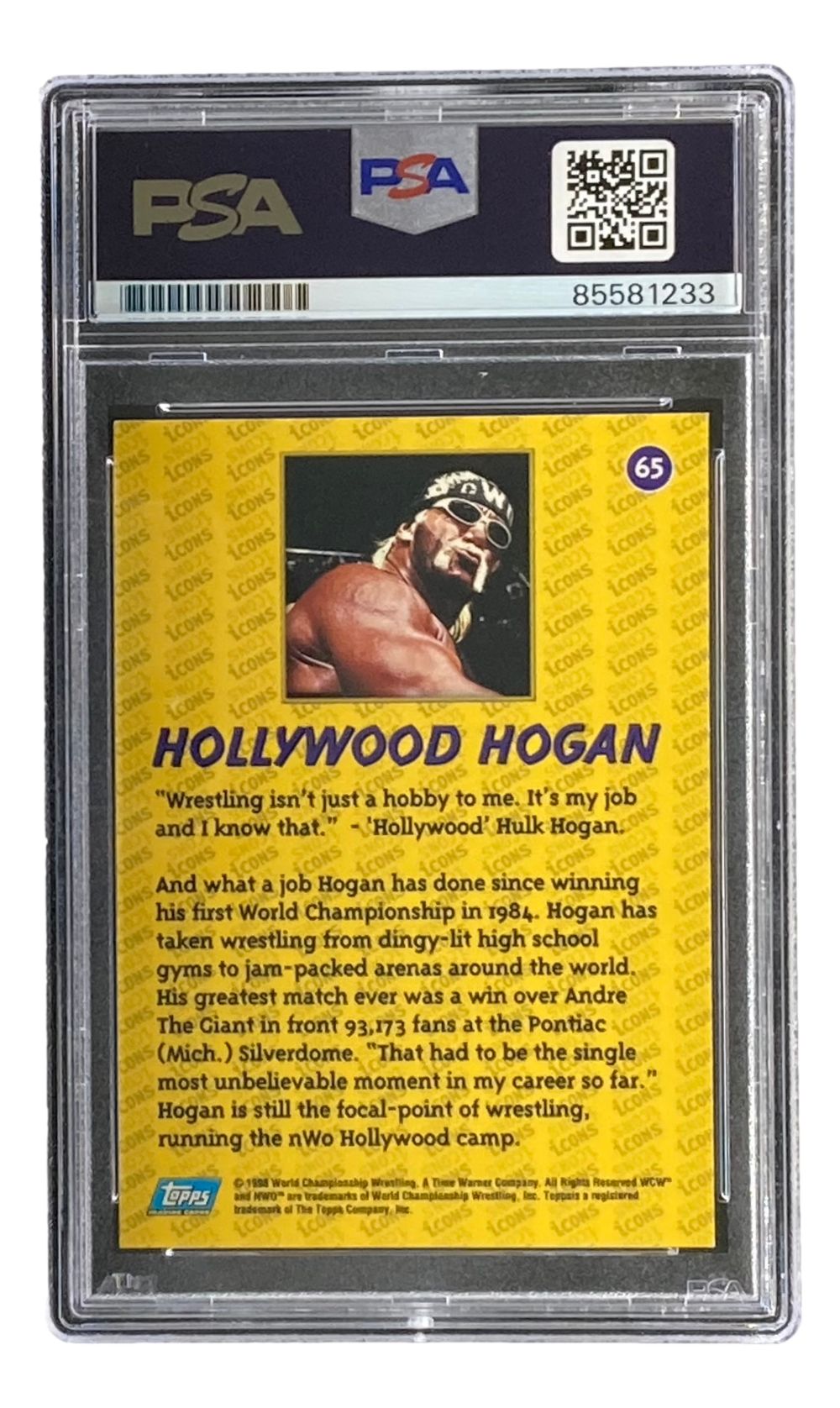 Featured is a Hulk Hogan signed 1998 Topps WCW #65 trading card. This card has been hand signed by Hogan and has been authenticated and encapsulated by PSA. This card would make a great addition to any sports memorabilia collection!