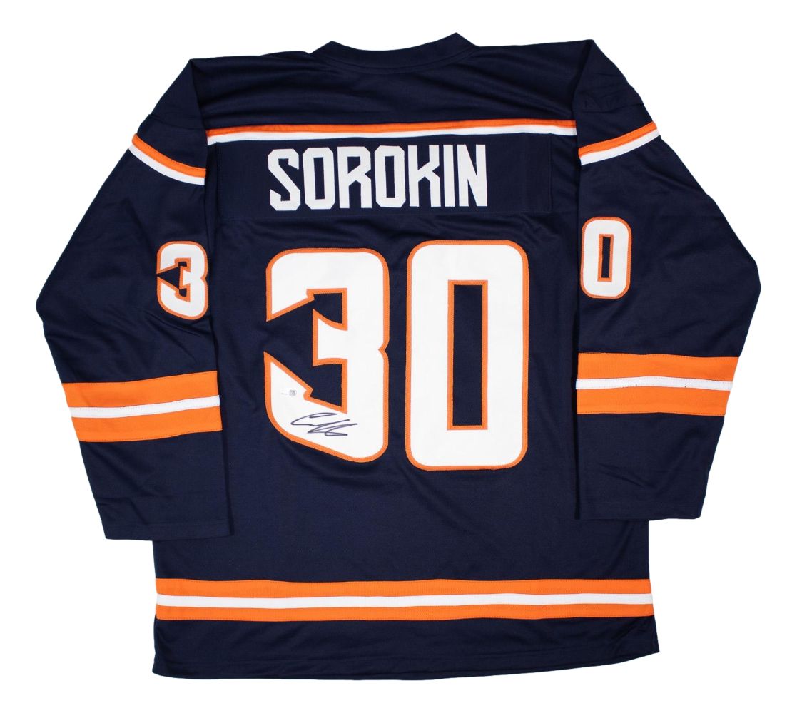 Featured is an Ilya Sorokin signed custom hockey jersey. This jersey has been hand signed by Sorokin and comes with the JSA hologram. This jersey features professionally sewn letters and numbers and is size XL. This jersey has no team tags or emblems and is intended as a sports collectible. This jersey would make a great addition to any sports memorabilia collection!.