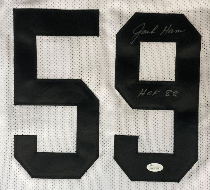 Featured is a Jack Ham signed custom football jersey, inscribed "HOF 88". This jersey has been hand signed by Ham and comes with the JSA hologram and certificate of authenticity. This jersey features professionally sewn letters and numbers and is size XL. This jersey has no team tags or emblems and is intended as a sports collectible. This jersey would make a great addition to any sports memorabilia collection!.