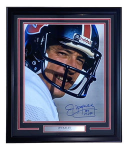 Featured is a Jim Kelly signed 16x20 Houston Gamblers photo, inscribed "84 MVP". This photo has been hand signed by Kelly and comes with the Steiner Sports hologram. This photo has been professionally framed and matted and is approximately 22x27..