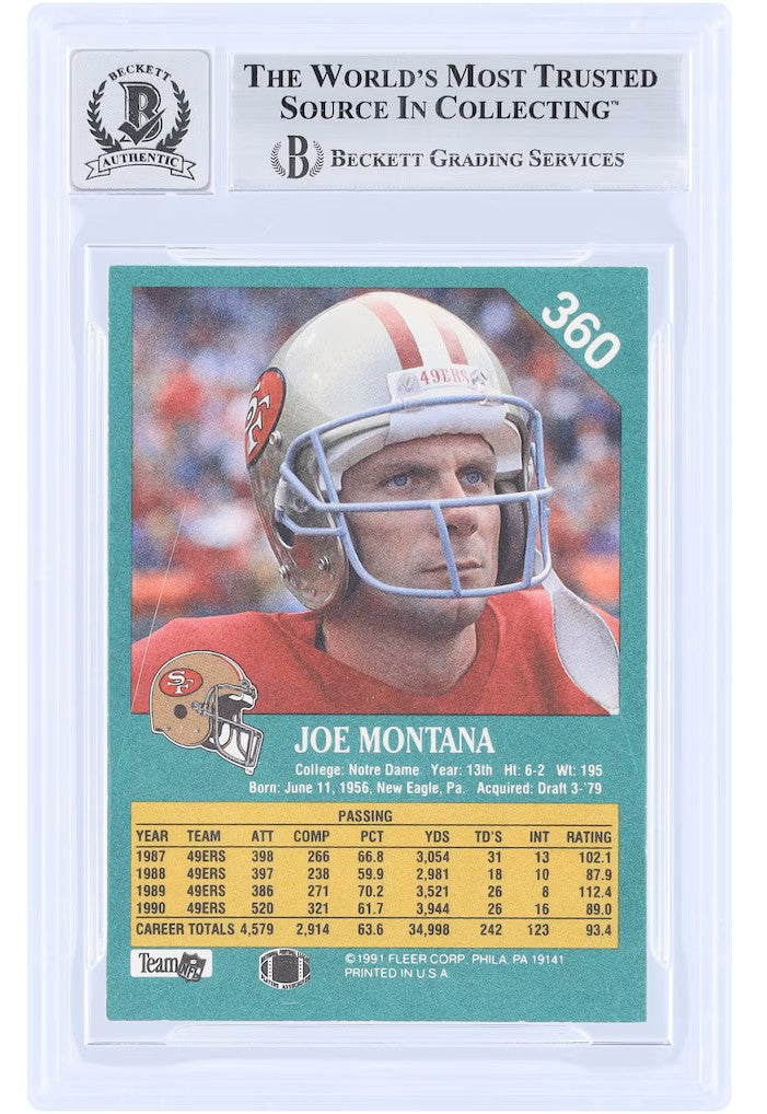 Featured is a Joe Montana signed 1991 Fleer #360 trading card. This card has been hand signed by Montana and has been encapsulated and authenticated by Beckett, receiving an autograph grade of 10. This card would make a great addition to any sports memorabilia collection! Stock image used.