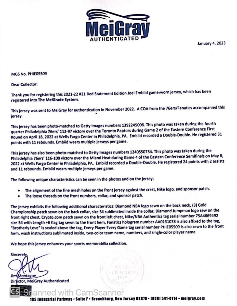 Featured is a Joel Embiid game used Philadelphia 76ers jersey. This jersey was worn by Embiid on May 8, 2022 vs Miami Heat. This jersey comes with the Fanatics hologram and certificate of authenticity, along with the MeiGray letter of authenticity. This jersey would make a great addition to any sports memorabilia collection!.