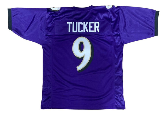 Featured is a Justin Tucker custom football jersey. This jersey features professionally sewn letters and numbers and is size XL. This jersey has no team tags or emblems and is intended as a sports collectible..