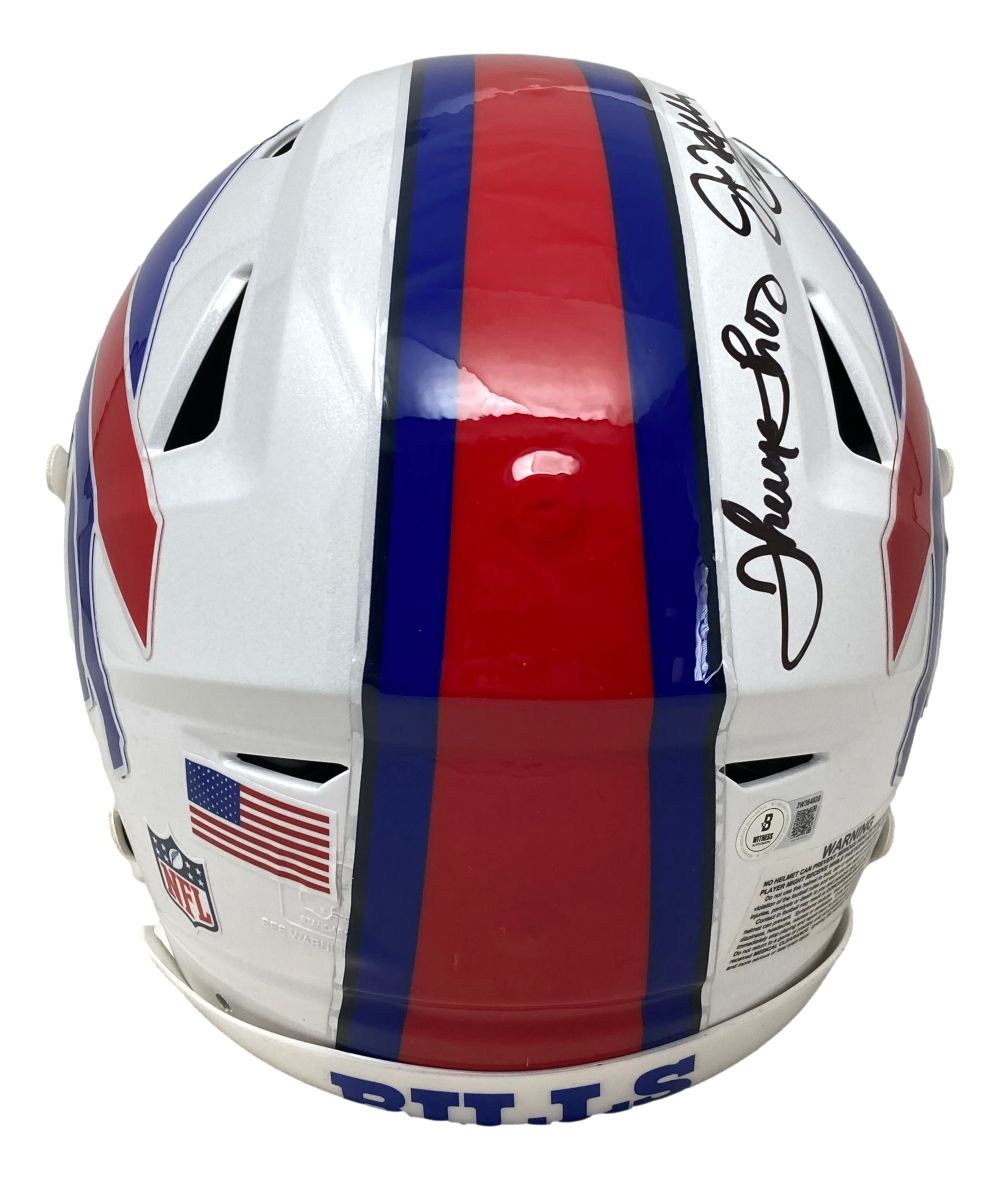 Featured is a Jim Kelly, Thurman Thomas and Andre Reed signed Buffalo Bills full size authentic SpeedFlex helmet, inscribed "Bills Dynasty". This helmet has been hand signed by Kelly, Thomas and Reed and comes with the Beckett witnessed hologram and certificate of authenticity. This helmet would make a great addition to any sports memorabilia collection!.