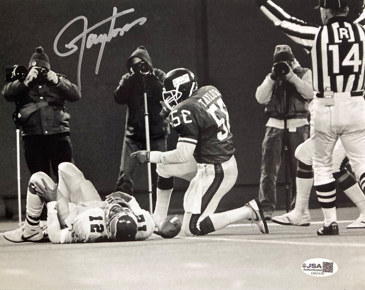 Featured is a Lawrence Taylor signed 8x10 New York Giants photo. This photo has been hand signed by Taylor and comes with the JSA QR hologram. This photo would make a great addition to any sports memorabilia collection..