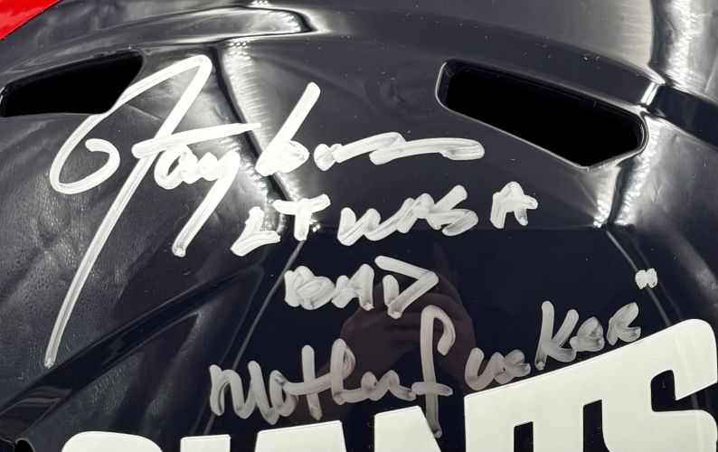 Featured is a Lawrence Taylor signed New York Giants full size speed replica helmet, inscribed "LT was a Bad M...fer". This helmet has been hand signed by Taylor and comes with the Beckett witnessed hologram and certificate of authenticity. Included with this helmet is a deluxe acrylic display case. This helmet would make a great addition to any sports memorabilia collection..