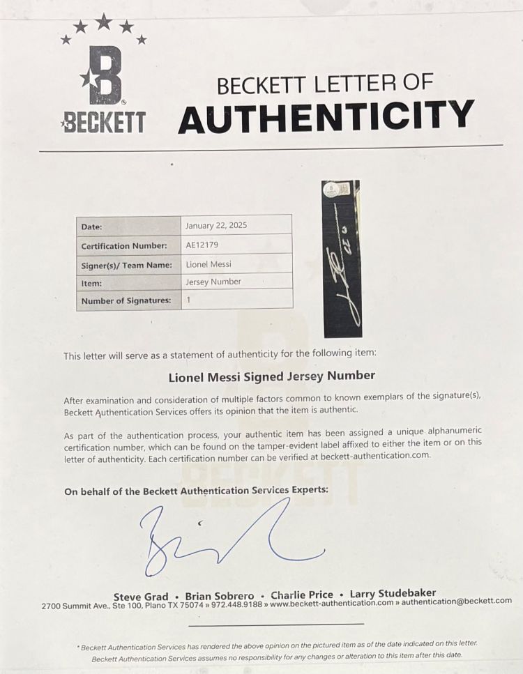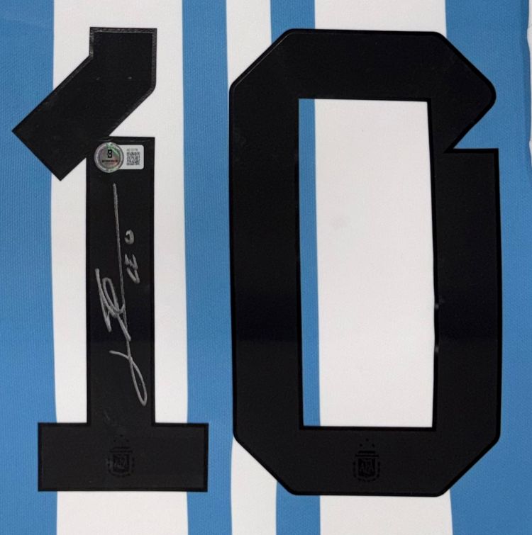 Featured is a Lionel Messi signed Argentina Adidas soccer jersey. This jersey has been hand signed by Messi and comes with the Beckett hologram and letter of authenticity. This jersey is size XL. This jersey has been professionally framed and matted and is approximately 32x42. This jersey would make a great addition to any sports memorabilia collection!.