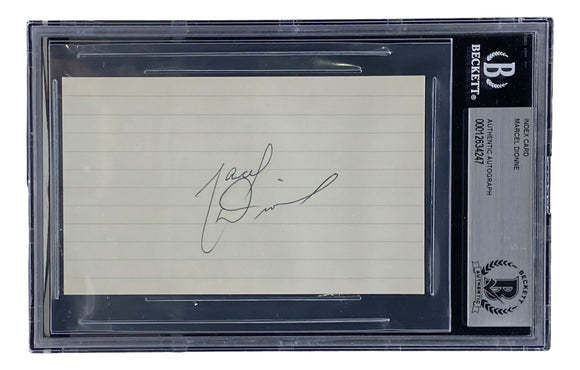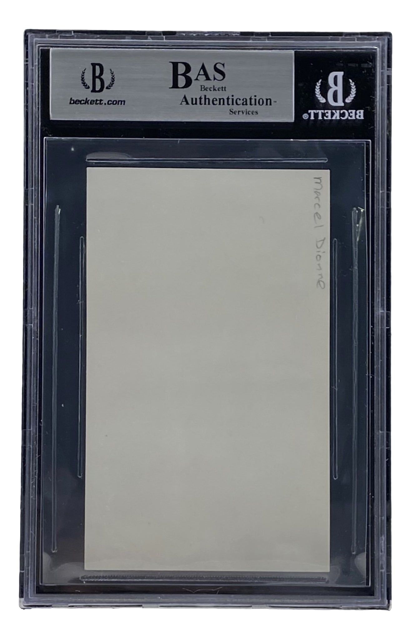 Featured is a Marcel Dionne Quebec Nordiques signed index card. This card has been hand signed by Dionne and has been slabbed and authenticated by Beckett. This card would make a great addition to any sports collection!