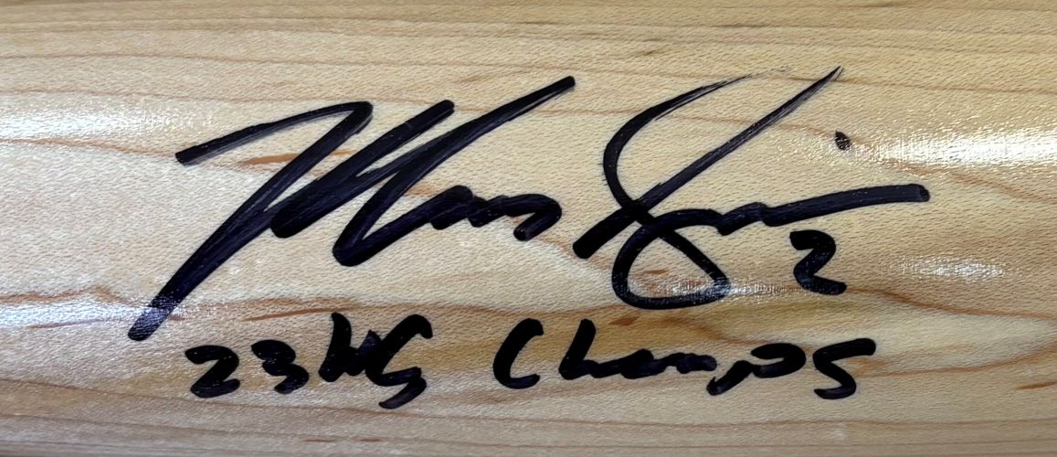 Featured is a Marcus Semien signed Louisville Slugger baseball bat, inscribed "23 WS Champs". This bat has been hand signed by Semien and comes with the Beckett hologram and certificate of authenticity. This bat would make a great addition to any sports memorabilia collection!.