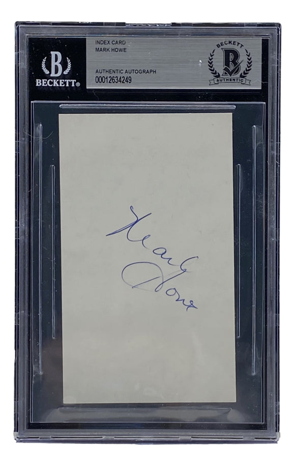 Featured is a Mark Howe Philadelphia Flyers signed index card. This card has been hand signed by Howe and has been slabbed and authenticated by Beckett. This card would make a great addition to any sports collection!