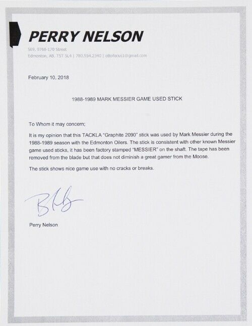 Featured is a Mark Messier game used Tackla Graphite 2090 hockey stick. This stick was used by Messier during the 1988-89 Stanley Cup championship season. This stick comes with the Perry Nelson Letter of Authenticity. Messier is second on the all-time career lists for regular season points (1887), playoff points (295) and regular season games played (1756). He is a six-time Stanley Cup champion - five with the Oilers and one with the Rangers, and is the only player to captain two different professional teams to championships. His playoff leadership while in New York, which ended a 54-year Stanley Cup drought in 1994, earned him the nickname "The Messiah", a play on his name. He was also known, over the course of his career, as "The Moose" for his aggression and strength. He twice won the Hart Trophy as the league's most valuable player, in 1990 and 1992, and in 1984 he won the Conn Smythe Trophy as the most valuable player during the playoffs. He is a 15-time NHL All-Star. In 2007, he was inducted into the Hockey Hall of Fame, in his first year of eligibility...