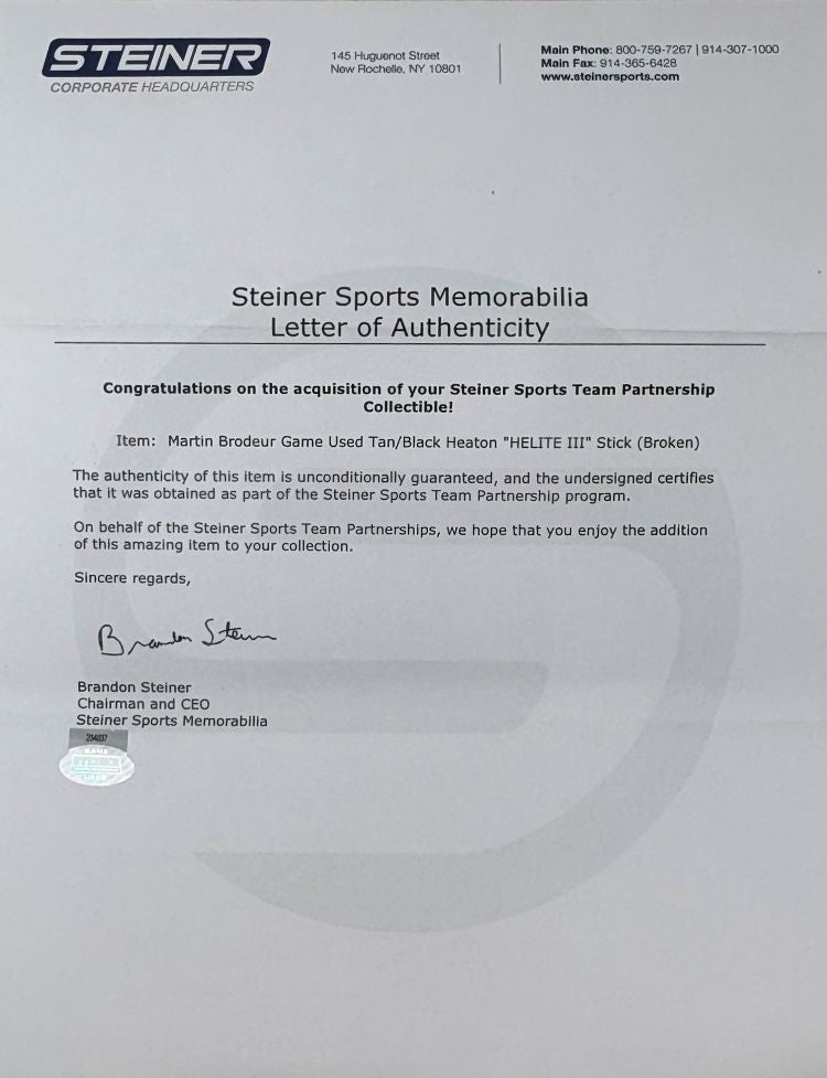 Featured is a Martin Brodeur 1995/96 Game Used Heaton Helite III goalie stick. This stick has been used by Brodeur and comes with the Steiner Sports hologram and letter of authenticity. This stick would make a great addition to any sports memorabilia collection!
