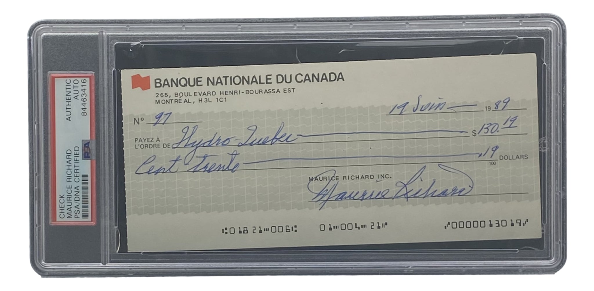 Featured is a Maurice Richard Montreal Canadiens signed bank check. This check was hand signed by Richard and has been authenticated and encapsulated by PSA/DNA. This check would make a great addition to any sports memorabilia collection!.
