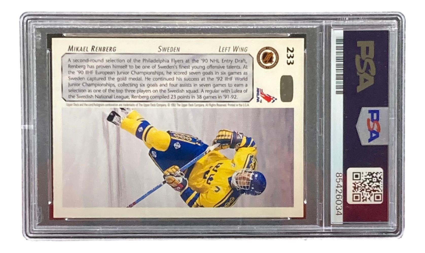 Featured is a Mikael Renberg signed 1992 Upper Deck #233 trading card. This card has been hand signed by Renberg and has been encapsulated and authenticated by PSA. This card would make a great addition to any sports memorabilia collection!