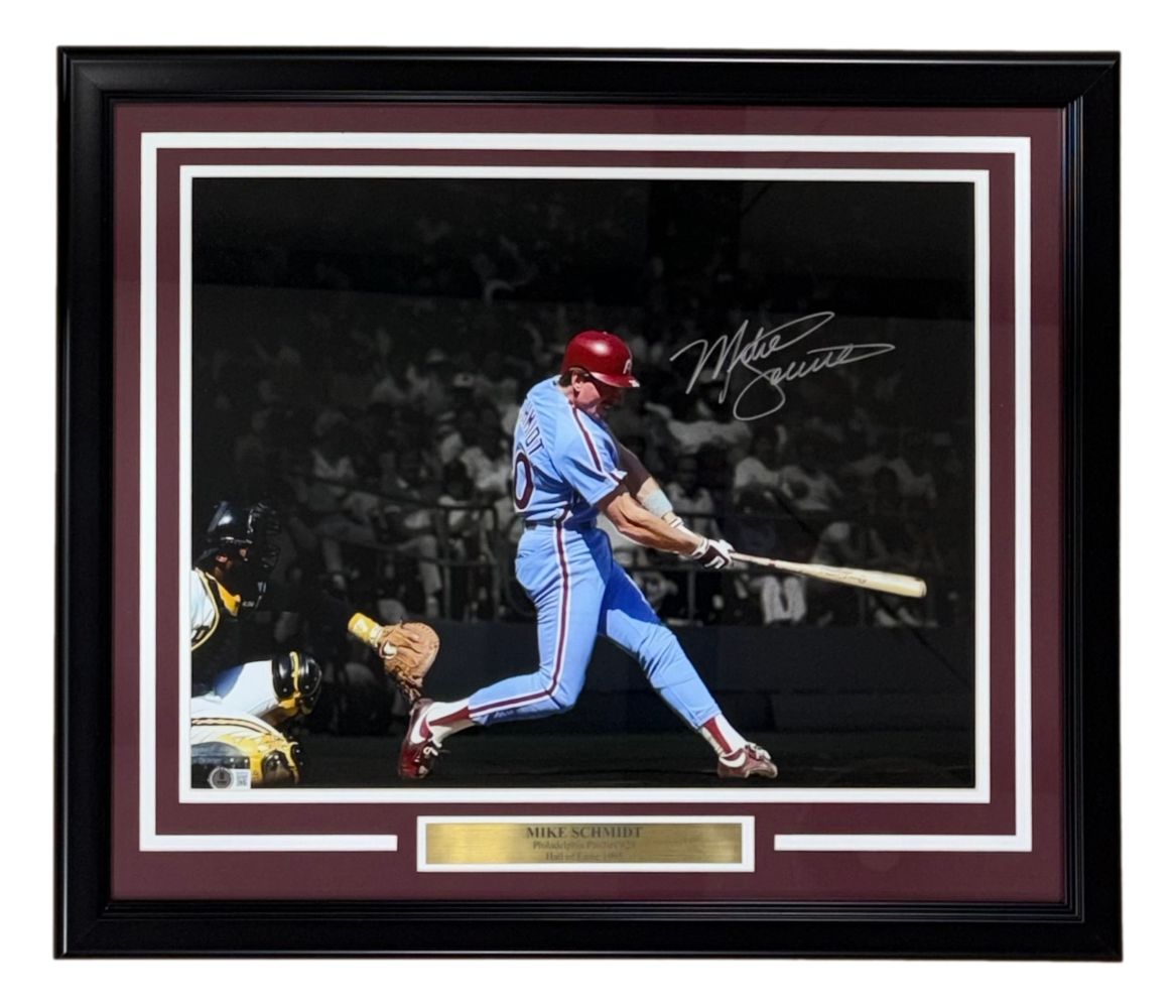 Featured is a Mike Schmidt signed 16x20 Philadelphia Phillies photo. This photo was hand signed by Schmidt and comes with the Beckett witnessed hologram and certificate of authenticity. This photo has been professionally framed and matted and is approximately 22x27..