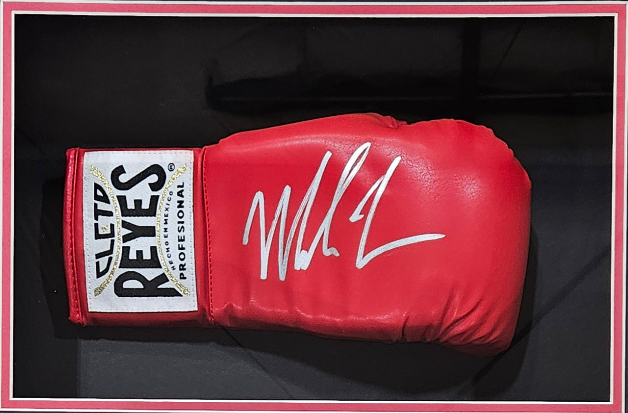 Featured is a Mike Tyson signed Cleto Reyes boxing glove. This glove has been hand signed by Tyson and comes with the JSA hologram and certificate of authenticity. This glove has been professionally framed in a shadow box and is approximately 18x19x4. This glove would make a great addition to any sports memorabilia collection!.