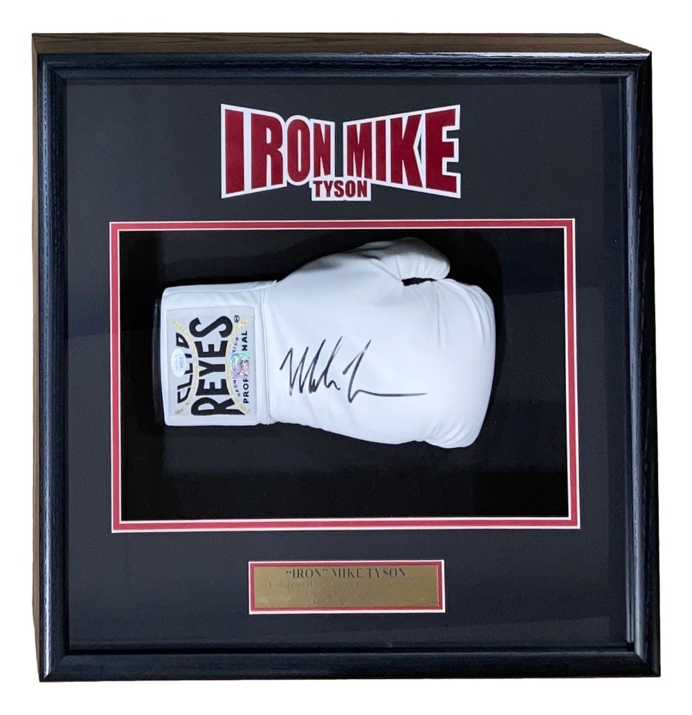Featured is a Mike Tyson signed Cleto Reyes boxing glove. This glove has been hand signed by Tyson and comes with the JSA hologram and certificate of authenticity. This glove has been professionally framed in a shadow box and is approximately 18x19x4. This glove would make a great addition to any sports memorabilia collection!.