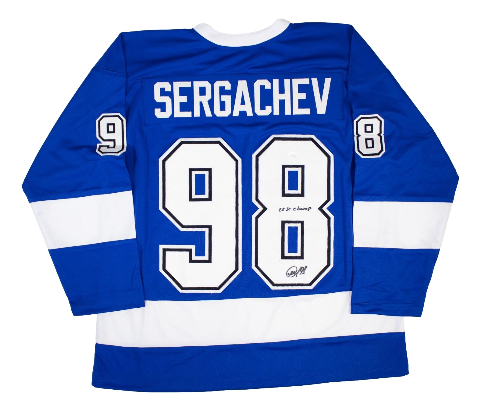 Mikhail Sergachev Tampa Bay Signed Blue Hockey Jersey 2x SC Champs JSA Hologram