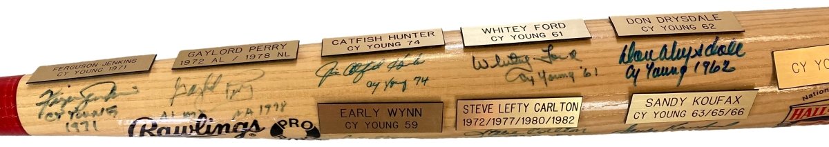 Featured is a Sandy Koufax, Tom Seaver, Don Drysdale, Whitey Ford, Catfish Hunter, Gaylord Perry, Fergie Jenkins, Rollie Fingers, Roger Clemens, Bob Gibson, Steve Carlton, Early Wynn, Warren Spahn, Jim Palmer, Bob Turley and Don Newcombe signed Rawlings baseball bat, each inscribed their Cy Young seasons. This bat comes with the Beckett hologram and letter of authenticity. This bat would make a great addition to any sports memorabilia collection!.