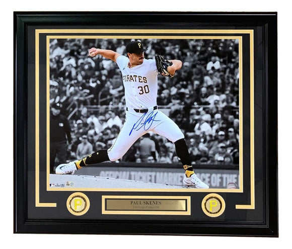 Featured is a Paul Skenes signed 16x20 Pittsburgh Pirates photo. This photo has been hand signed by Skenes and comes with the MLB hologram. This photo has been professionally framed and matted and is approximately 22x27. This photo would make a great addition to any sports memorabilia collection!.