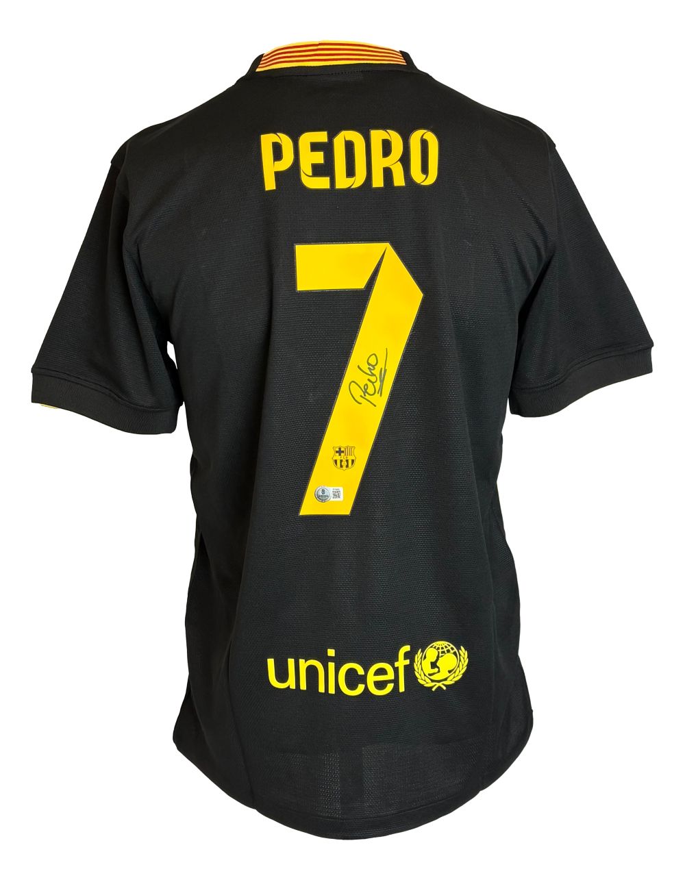 Featured is a Pedro signed Barcelona Nike soccer jersey. This jersey has been hand signed by Pedro and comes with the Beckett hologram and certificate of authenticity. Jersey size may vary. This item would make a great addition to any sports memorabilia collection!.