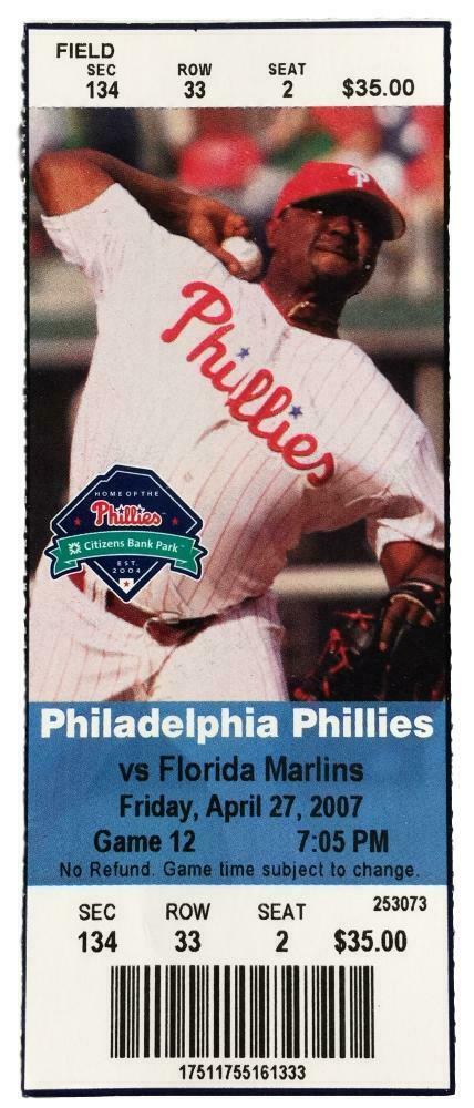 Featured is a Philadelphia Phillies game ticket. This ticket was used on April 27, 2007. On this day, the Phillies defeated the Marlins 6-5..