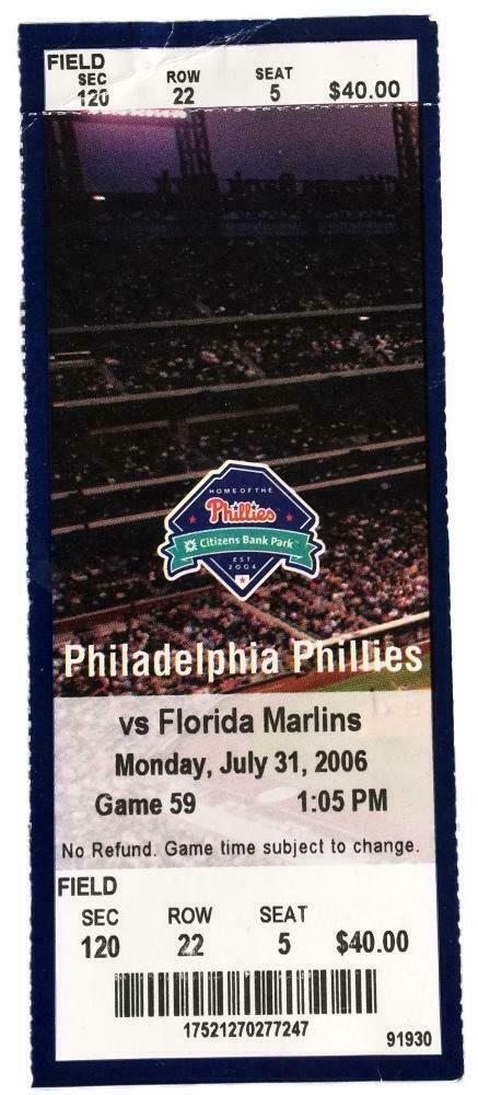 Featured is a Philadelphia Phillies game ticket. This ticket was used on July 31, 2006. On this day, the Marlins defeated the Phillies 15-2..