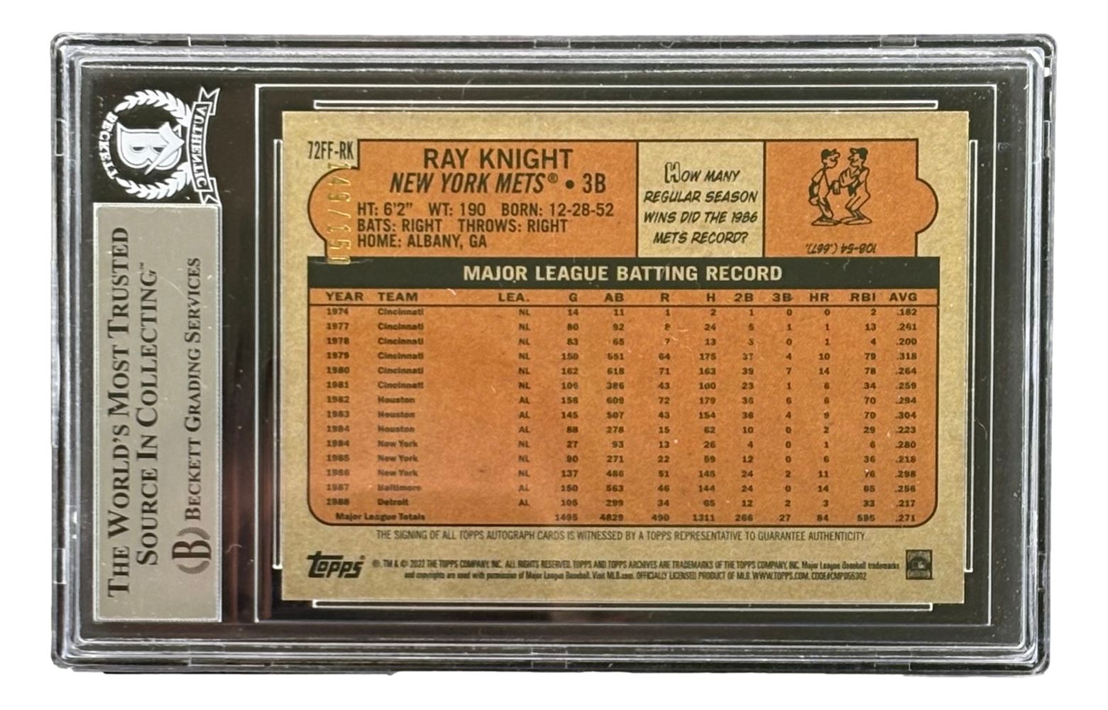 Featured is a Ray Knight signed 2022 Topps Archives #72FFRK trading card. This card has been hand signed by Knight and has been authenticated and encapsulated by Beckett. This card would make a great addition to any sports memorabilia collection.